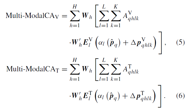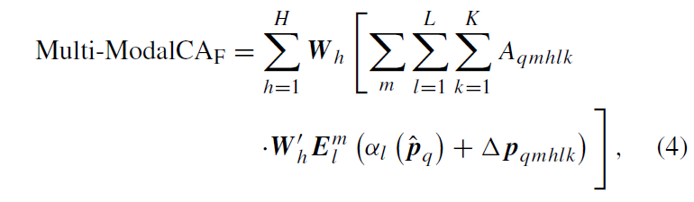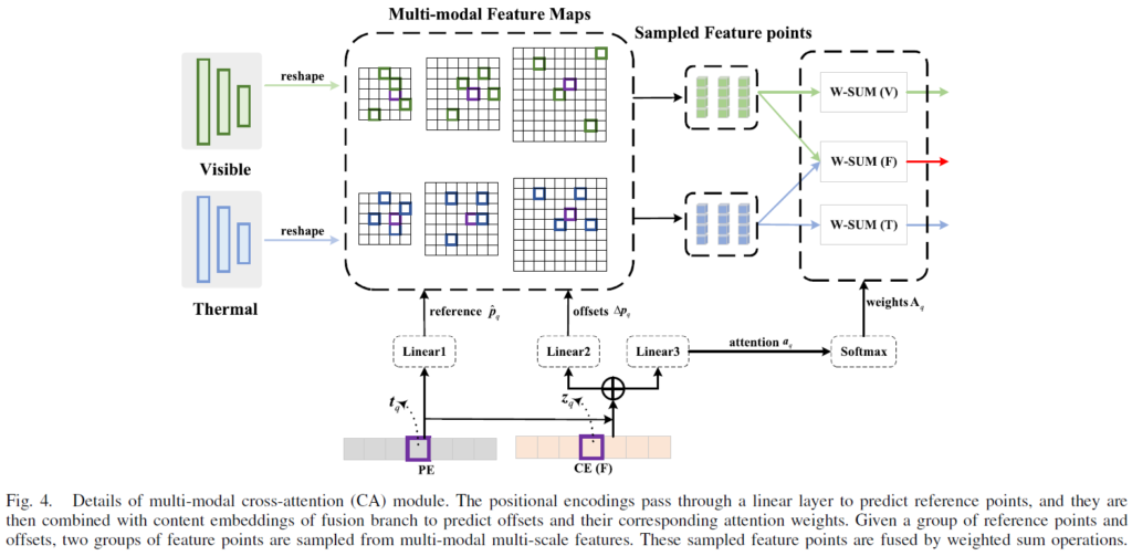 \hat{p}_{q}은 q번째 쿼리의 reference point이고, m은 modality를, 그리고 h는 attention head, l은 feature scale, k는 sampling point를 의미합니다. {α}_{l}(\hat{p}_{q})는 \hat{p}_{q}를 l번째 scale의 input feature map으로 re-scale하게 됩니다. Δ{p}_{qhlk}와 {A}_{qhlk}는 h번째 attention head의 l번째 feature level 안에 있는 k번째 sampling point의 sampling offset과 scalar attention weight를 의미합니다(복잡하네요..). Fig 4에서 visible 및 thermal feature의 퓨전은 두 모달리티의 prominent key elements aggregating 과정에서만 수행되는 것을 확인할 수 있습니다. 이 과정을 본따 “loosely coupled fusion”으로 이름 붙였다고 합니다. Fig 4의 과정에서, offset Δ{p}_{q}는 Δ{p}_{q}^{V}와 Δ{p}_{q}^{T}로 나뉘고, attention weight {a}_{q}도 modality specific component {a}_{q}^{V}와 {a}_{q}^{T}로 나뉘게 됩니다. softmax 정규화 이후, 각 모달리티 특화 어텐션 가중치 {A}_{q}^{V} = Softmax({a}_{q}^{V})와 {A}_{q}^{T} = Softmax({a}_{q}^{T})를 얻게 됩니다. 따라서, multi-modal cross-attention module CA 내의 uni-modal 특징의 두 extra group은 다음과 같이 얻어집니다.