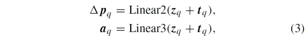 한편, q번째 positional encoding {t}_{q}도 fusion branch의 content embedding {z}_{q}과 결합되어 샘플링 포인트 Δ{p}_{q}의 offset을 바로 예측하게 되고, 이들의 corresponding attention weights {a}_{q}는 두 독립된 linear layer를 거치게 됩니다.