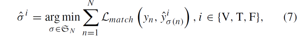 1. 수식 (7), (8)번 이후, V, T, F에 대한 L_match를 각각 계산한 뒤, 각 3가지 permutation에서의 매칭 코스트를 비교하여 optimal permutation을 얻게 된다고 생각하시면 될 것 같습니다.