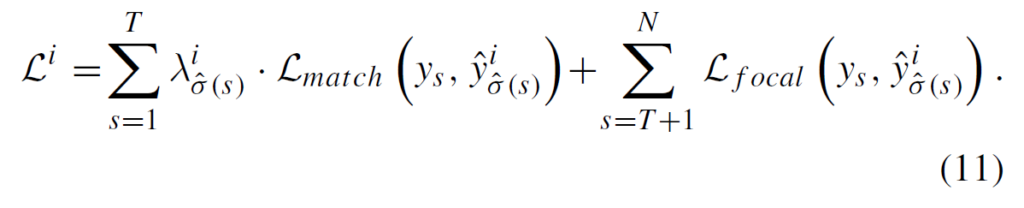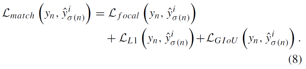 7번 수식에서 {L}_{match}()는 Ground Truth와 예측값 사이의 matching cost이고, 다음과 같이 계산됩니다. 여기 부분들은 DETR의 학습 과정을 연상하시면 이해가 어렵지 않을 것입니다.