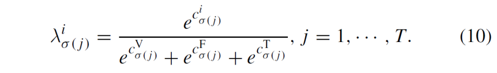 디코더의 출력값을 modality-specific detection head에 전달해서, 3세트(Visible, Thermal, Fusion)의 예측값 \hat{y}_{n}^{i}, i ∈ {V, T, F}을 얻게 됩니다. 각 모달리티마다 다른 특성을 가지고 있기에 예측값들은 일관적이지 않을 것입니다. 다른 모달리티 간 기여도 밸런스를 맞추기 위해, 저자들은 해당 iteration에서 slot predictions의 최적의 permutation을 비교한 다음 선택하도록 하였습니다. 이후에는 선택한 permutation \hat{σ}에 따라 모든 세 branch의 예측값들을 재배였하도록 하였습니다. \hat{σ}를 얻기 위해, 먼저 각 branch에서 최적의 permutation을 계산합니다.