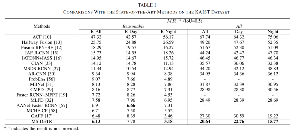 - 멀티스펙트럴 보행자 검출에서 널리 사용되는 KAIST, CVC-14, LLVIP 데이터셋을 활용하여 제안한 방법론의 효과에 대한 실험들을 수행하였다. 실험 결과 MS-DETR의 우수성을 입증하였다.