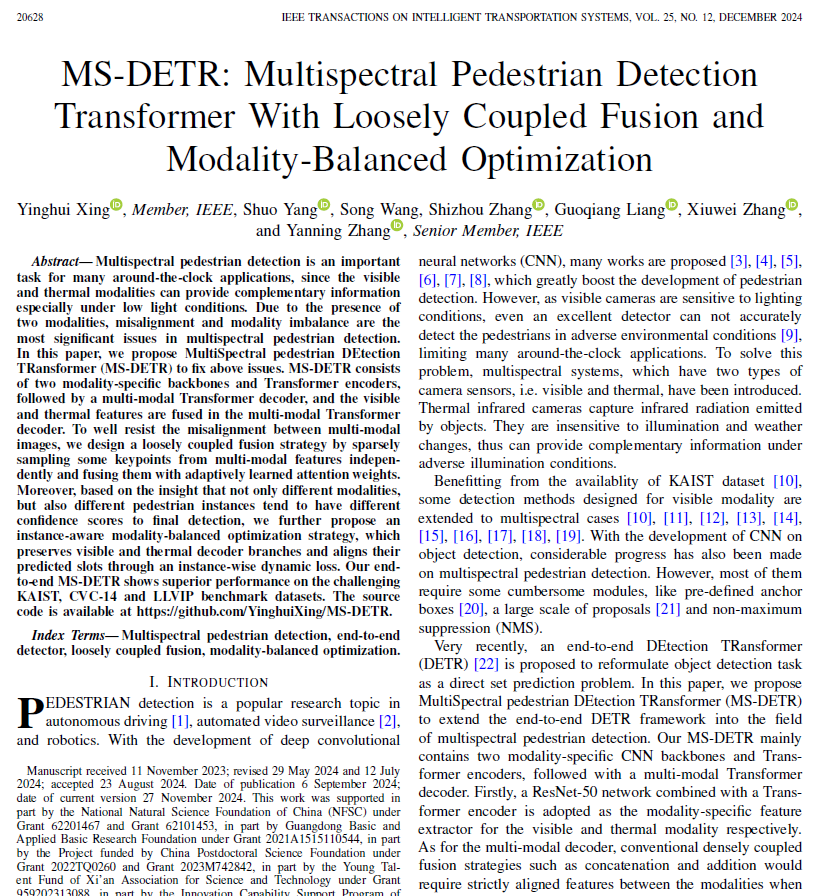 안녕하세요, 허재연입니다. 오늘 리뷰할 논문은 2024년 12월 IEEE Transactions on Intelligent Transportation Systems에 게재된 논문입니다. DETR기반 multispectral detector이 아직 많지 않은 상황에서, DETR 구조를 기반으로 검출기를 제안한 (transaction이라 conference쪽보다는 게재 기간이 길었겠지만)나름 최신 논문이기에 그 내용이 궁금하여 읽어보게 되었습니다. 가벼운 마음으로 읽기 시작했는데 내부 기호 및 요소들이 복잡해서 읽는데 시간이 좀 오래 걸렸네요.