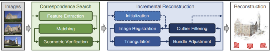 SfM은 여러 이미지들에서 특징점을 추출해서 카메라의 움직임과 3D 구조를 복원하는 기법이고, SIFT와 같은 알고리즘을 통해 keypoint를 검출하고 여러 이미지들간의 픽셀 대응관계를 찾아 기하학적 관계를 추정한다고 합니다. 매칭된 결과들은 Geometric Verification 이후 삼각측량을 활용해 대응되는 픽셀들을 이용해 각 점의 3D좌표를 계산하고 카메라 포즈와 3D point들을 최적화하는 Bundle Adjustment를 거친 후 최종적으로 outlier들을 없애준 뒤 3D 모델을 생성합니다. 최근에는 특징점을 검출하거나 매칭, bundle adjustment 과정에서 딥러닝을 도입해 learning based 기법이 적용되면서 크게 개선됐다고 합니다. Matching 과정에서는 CNN기반의 SuperGlue나 더 나아가 ViT 기반의 LoFTR 방법도 존재합니다. 하지만 SfM은 일련의 과정들이 sequential 하게 일어나기 때문에, 각 요소들에서 발생할 수 있는 노이즈나 오류가 많아 취약하다고 합니다.