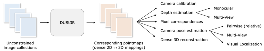 DUSt3R 또한 이런 direct RGB-to-3D를 수행하는것을 목표로 하지만, intrinsic 파라미터가 필요하지 않을 뿐 만 아니라 네트워크에서 두 개의 viewpoint를 동시에 처리해(Multiview) pointmap을 출력해서, DepthMap을 통해 reconstruction을 하는것이 아니라 더 직접적으로 3D 좌표를 예측한다고 합니다. 과거에도 SfM 파이프라인을 미분 가능하게 만들어 end to end로 학습하려는 개념들이 등장했는데, 이러한 개념에 기반하지만 DUSt3R는 2d dense field인 pointmap을 예측하기 때문에 카메라 포즈를 명시적으로 예측하지 않고도 regression 문제를 well-posed로 정의해 명확한 결과물을 반환한다고 합니다. 단일 이미지에서 3D를 복원하려는 경우 여러가지 정답의 경우의 수를 염두에 두어야 하기 때문에 ill-posed이고, 작은 변화에도 결과에 큰 변화가 생길 수 있지만 DepthMap과 카메라 포즈를 따로 예측하지 않는 (pointmap만 예측하는) well-posed regression을 수행하기 때문에 이 과정에서 일관되고 안정적인 결과를 기대할 수 있습니다.
