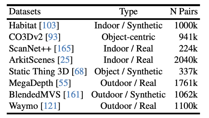 학습 할 때 8개의 데이터셋을 취합해 8.5M의 image pairs를 만들어 사용했습니다. Habitat, ARKitScenes, MegaDepth, Static Scenes 3D, Blended MVS, ScanNet++, CO3D-v2, Waymo 데이터 셋들을 활용했는데, Image pair가 명시적으로 없는 데이터셋은 image retrieval과 point matching 알고리즘을 이용해 매칭시켜 주었습니다. 그 결과 Indoor, outdoor, synthetic, real-world, object-centric 등 다양한 scene type에서 학습을 진행할 수 있었다고 합니다. 인코더는 ViT-Large , 디코더는 ViT-Base , head는 DPT를 사용했습니다. CroCo pretraining을 이용해 initialize 합니다.