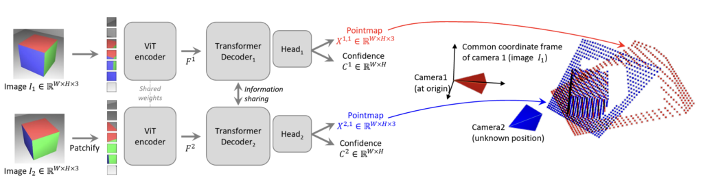 <br>G_1^i = \text{DecoderBlock}_1^i(G_1^{i-1}, G_2^{i-1}), \quad<br>G_2^i = \text{DecoderBlock}_2^i(G_2^{i-1}, G_1^{i-1})<br>를 얻고 토큰을 MLP에 전달합니다. 위 첨자가 view의 index, 아래 첨자가 블럭의 index 입니다. 따라서 1번과 2번 view의 i−1번째 token이 i번째의 입력으로 사용됨으로써 cross-attention이 이루어지고, 정보교환이 일어납니다. 이를 통해 3D 정보를 직접 학습하고, 여러개의 view를 자연스럽게 통합할 수 있습니다. 이후 각 branch에서 개별적인 regression head가 디코더 토큰을 입력받아 pointmap과 confidence map을 출력합니다. 기본적으로 3D 정보를 가지고 있는 pointmap을 예측하기 때문에 모델이 예측한 객체를 얼마나 신뢰할 수 있는지에 대한 수치를 confidence map으로 제공합니다.