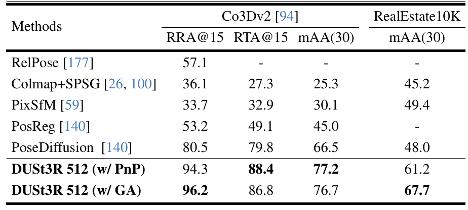 각 이미지 쌍 사이의 상대적인 카메라 transformation을 추정하는 Multi-View Relative Pose Estimation 작업도 평가했습니다. CO3Dv2와 RealEstate10k를 사용했고 RelPose,PoseDiffusion과 같은 Learning-based 기법과 더불어 PixSFM, COLMAP+SuperPoint+SuperGlue와 같은 Structure-based 기법들과도 비교했습니다. 평가지표로는 각 이미지 쌍에서 예측된 회전의 오차(Relative Rotation Accuracy), 이동 오차(Relative Translation Accuracy), 해당 수치들이 임계값(15) 이내에 있는 비율, 각 값들의 최소값에 대한 AUC (mAA)에서 mAA = 30까지의 면적입니다. 결과는 PoseDiffusion 보다도 기존 SOTA성능을 능가했습니다.