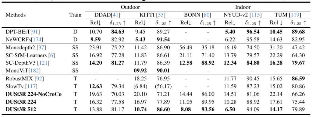 한 장의 이미지를 받아 각 픽셀의 Depth 정보를 추정하는 Monocular Depth Estimation도 수행헀는데 DUSt3R에 동일한 이미지를 두 장 입력하고 모델이 하나의 이미지(동일한 두 이미지)를 사용해 예측한 pointmap의 z좌표를 깊이로 사용했습니다. 평가 데이터셋은 outdoor 로 DDAD, KITTI를 사용했고, indoor로 NYUv2, BONN, TUM를 사용했습니다. 평가지표로는 예측된 depth와 실제 depth간의 상대오차인 Absolute Relative Error와 실제 depth와 25% 이내의 오차로 예측한 픽셀의 비율인 Prediction Threshold Accuracy(1.25)를 사용했습니다. 실험결과 zero shot에서 SOTA인 SlowTv와 비슷한 수준의 성능을 보였습니다.
