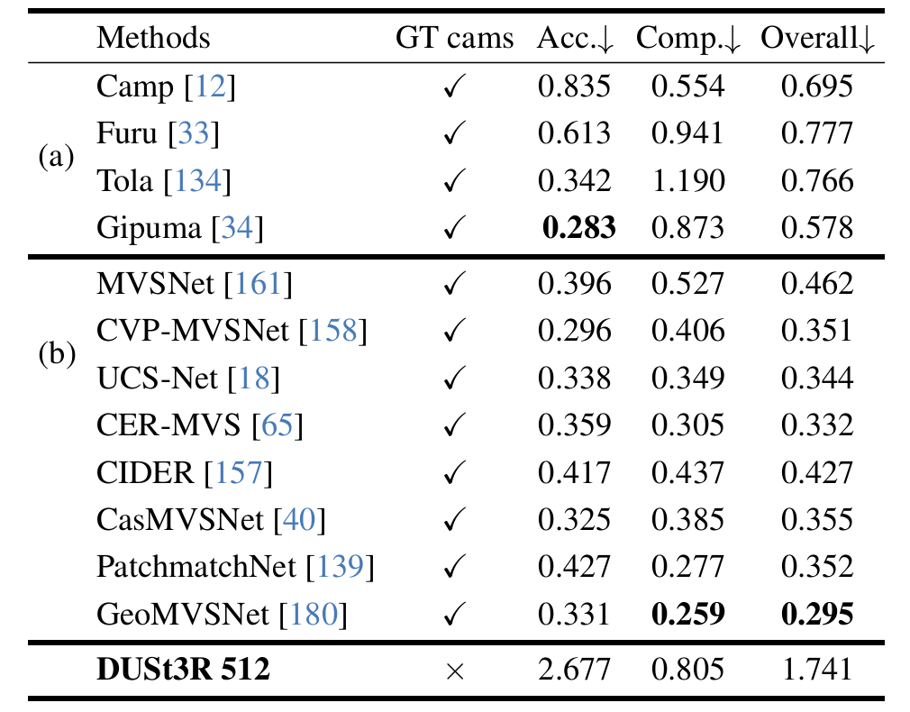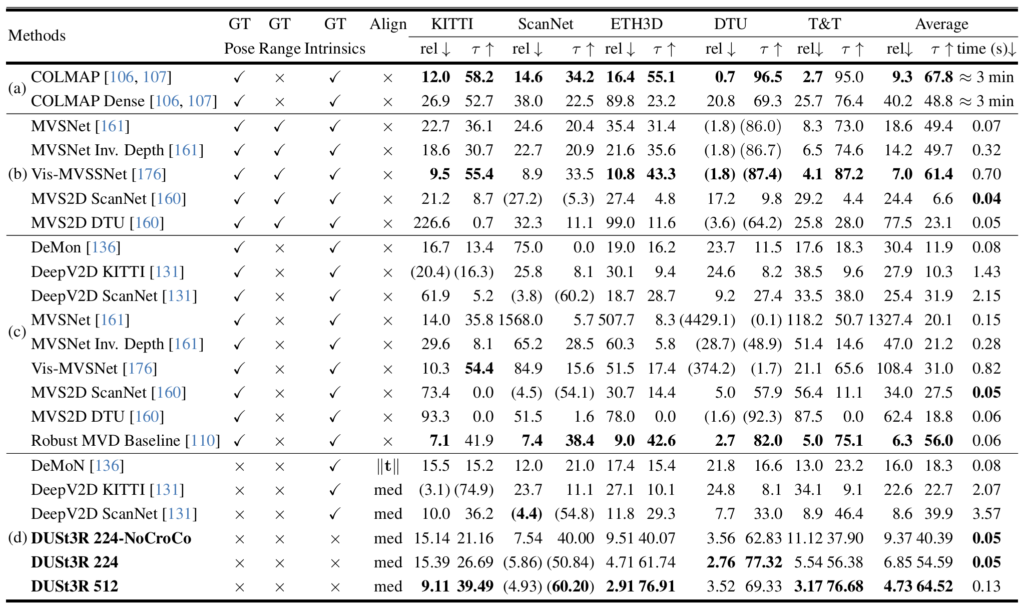 다양한 뷰에서의 이미지들을 활용해 Depth Estimation을 진행하는 실험도 진행했습니다. 여기서도 예측된 pointmap의 z값을 depth로 사용했다고 합니다. 작은 물체를 복원하기 위해 사용하는 DTU, 실내/외 장면이 포함된 ETH3D, 대규모 실외 장면들로 구성된 Tanks and Temples, 실내 중심의 ScanNet을 사용해 평가했고, 평가기준은 Monocular Depth Estimation을 평가할때와 유사하게 Absolute Relative Error와 정답 값과 예측값의 비율이 특정 비율 (1.03) 이내에 있는 픽셀들의 비율로 평가했습니다. 평가결과 ETH3D 에서는 기존 SOTA 방법보다 좋은 성능을 보였습니다.