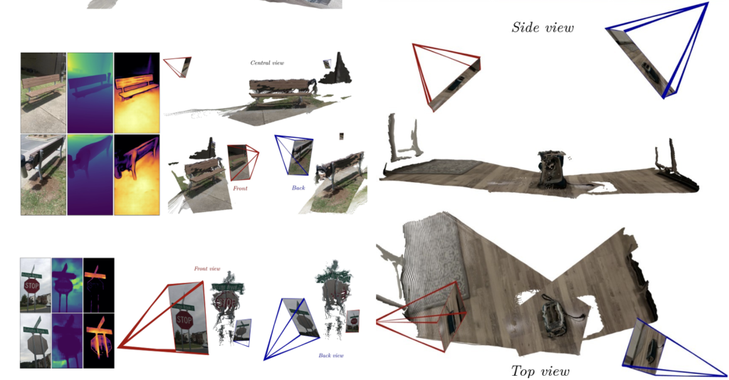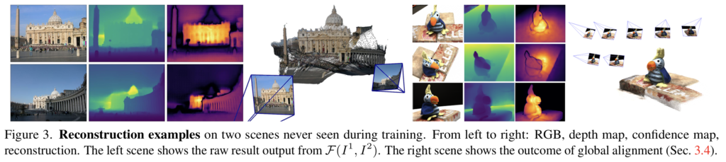 이렇게 학습된 모델은 아래와 같이 한 번도 보지 못했던 scene에서 RGB사진을 통해 depth map, confidence map을 구하고 3D reconstruction을 진행합니다. 다양한 scene에서의 이미지들도 global alignment를 통해 하나의 좌표계에 합쳐져 3D reconstruction된 모습을 보여줍니다.