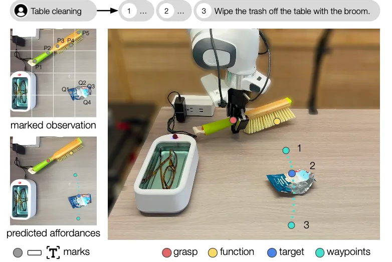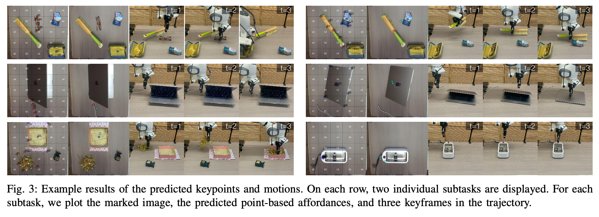 위의 그림이 이 태스크를 간단히 보여주는 그림인데요. 보면 Table cleaning이라는 user 명령이 들어오고, 1,2,3 이런 순으로 무언가 작업을 구체화하는 text가 가장 상단에서 이루어진 것을 볼 수 있습니다. 그러면서 좌측 이미지를 보시면, 이미지 내 후보 포인트를 표시하고, VLM에 쿼리하여 최적의 포인트 집합으로써 afforadance 포인트를 선택하는 과정을 보여줍니다. 이렇게 예측된 affordance를 키포인트와 웨이포인트로써 picking, placing, pressing, tool use 등 다양한 매니퓰레이션 태스크에 대한 모션 trajectory를 정의하는 데 활용하는 방식으로 본 방법론이 구성되게 됩니다.
