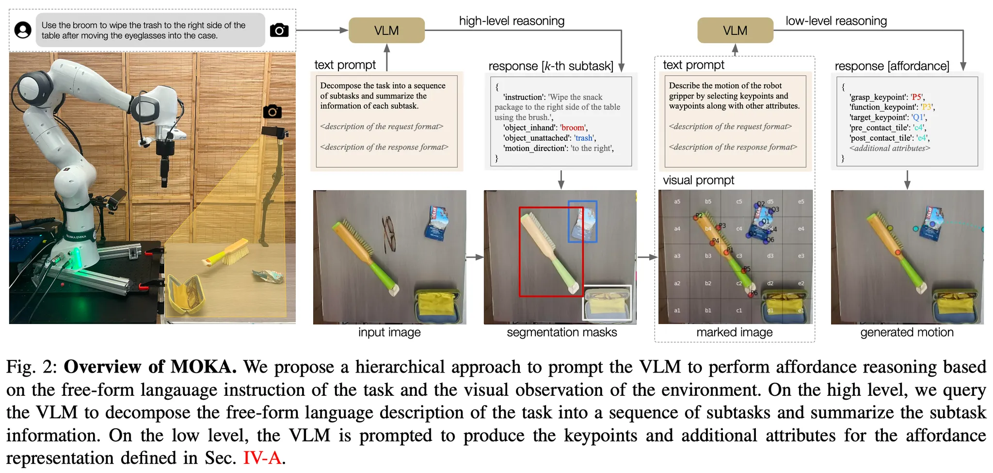 MOKA는 이런 sub-task를 계층적 처리 방식, 즉 high-level reasoning, low-level reasoning 으로 나누어 태스크를 진행합니다.
