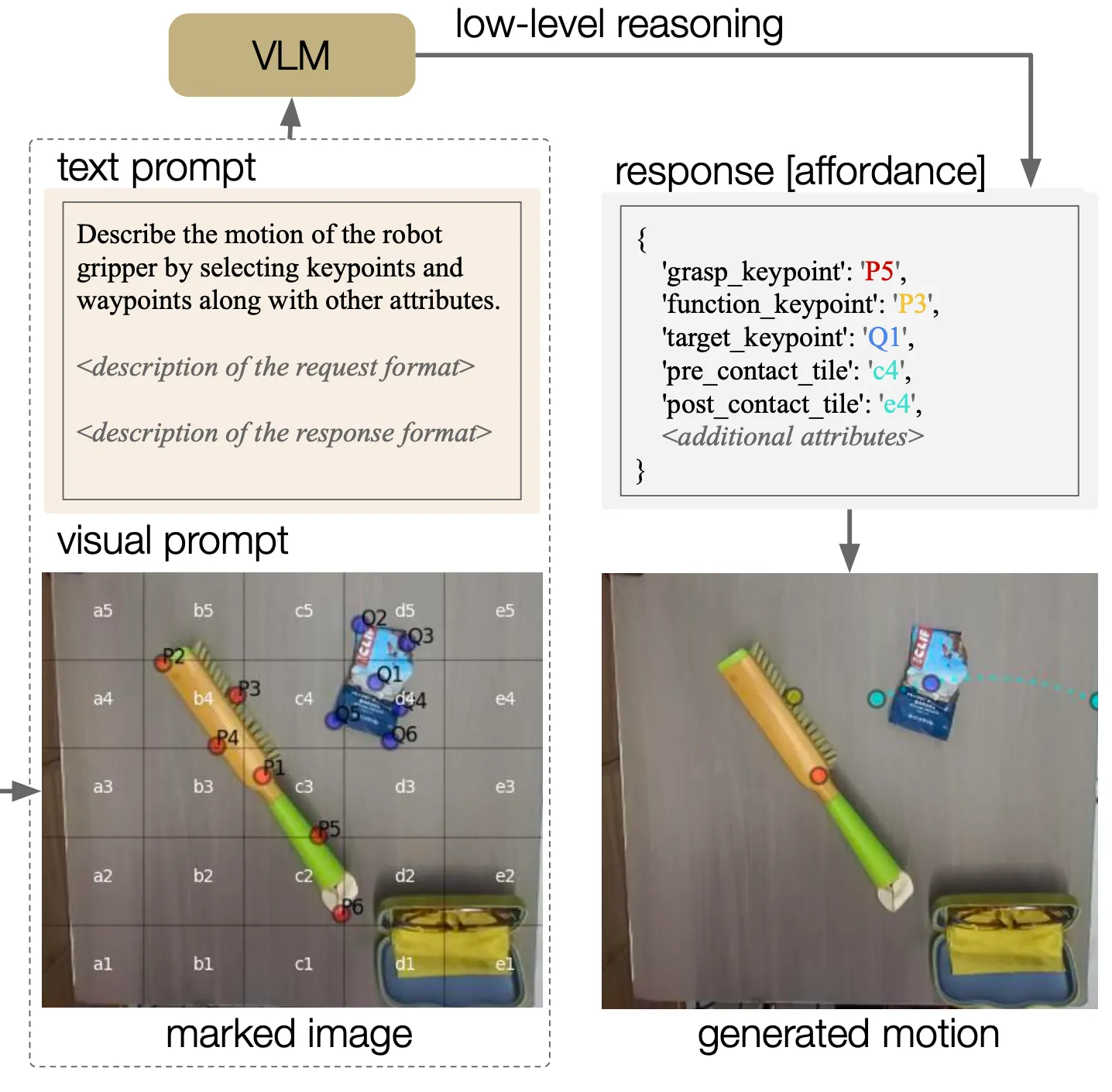 기존 연구인 kpam, keto 방식들을 기반으로 다양한 로봇 매니퓰레이터 태스크에 적용할 수 있는 key point based affordance representation을 구성했습니다. 매번 다른 사전정의 기술에 의해 구분되는 다양한 motion primitives 대신에, 통일된 구조의 keypoints와 waypoints를 motion 구체화에 사용했습니다. 이를 VLM을 통해 2D 이미지에서 예측된 포인트를 3D 공간에서의 pose로 변환하여 로봇 동작을 매끄럽게 생성할 수 있도록 했습니다. 이를 수행하기 위해선 로봇은 다음의 생성된 motion trajectory를 기반으로 환경과 상호작용합니다.