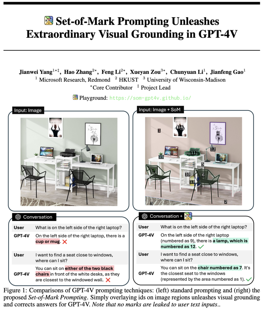 MOKA의 low-level 추론에서 눈에 띄는 점은 Mark-Based Visual Prompting 방식입니다. 이미지 위에 점, 격자, 텍스트 annotation을 마킹하여 VLM의 시각적 reasoning 능력을 끌어올리는 것인데요. 아래의 Set-of-Mark Prompting 을 활용한 GPT-4V에서의 visual grounding 수행 연구의 컨셉을 가져왔다고 합니다.