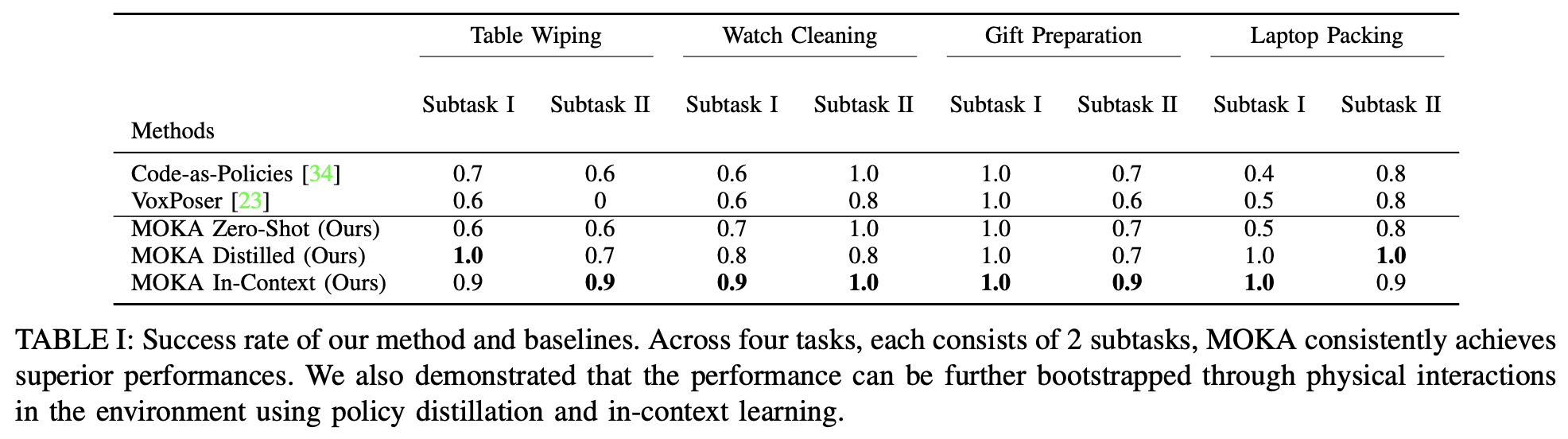 - In-Context Learning: MOKA가 생성한 데이터를 VLM에 제공하여 성능 향상.