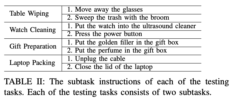 Fig1 을 예로 들면, “안경을 치운 후, 테이블 위의 쓰레기를 닦아라”라는 instruction은 2개의 sub-task로 나눌 수 있습니다. 1. 안경을 안경 케이스로 옮긴다. 2. 빗자루를 사용하여 쓰레기를 쓸어낸다. 가 되겠습니다.