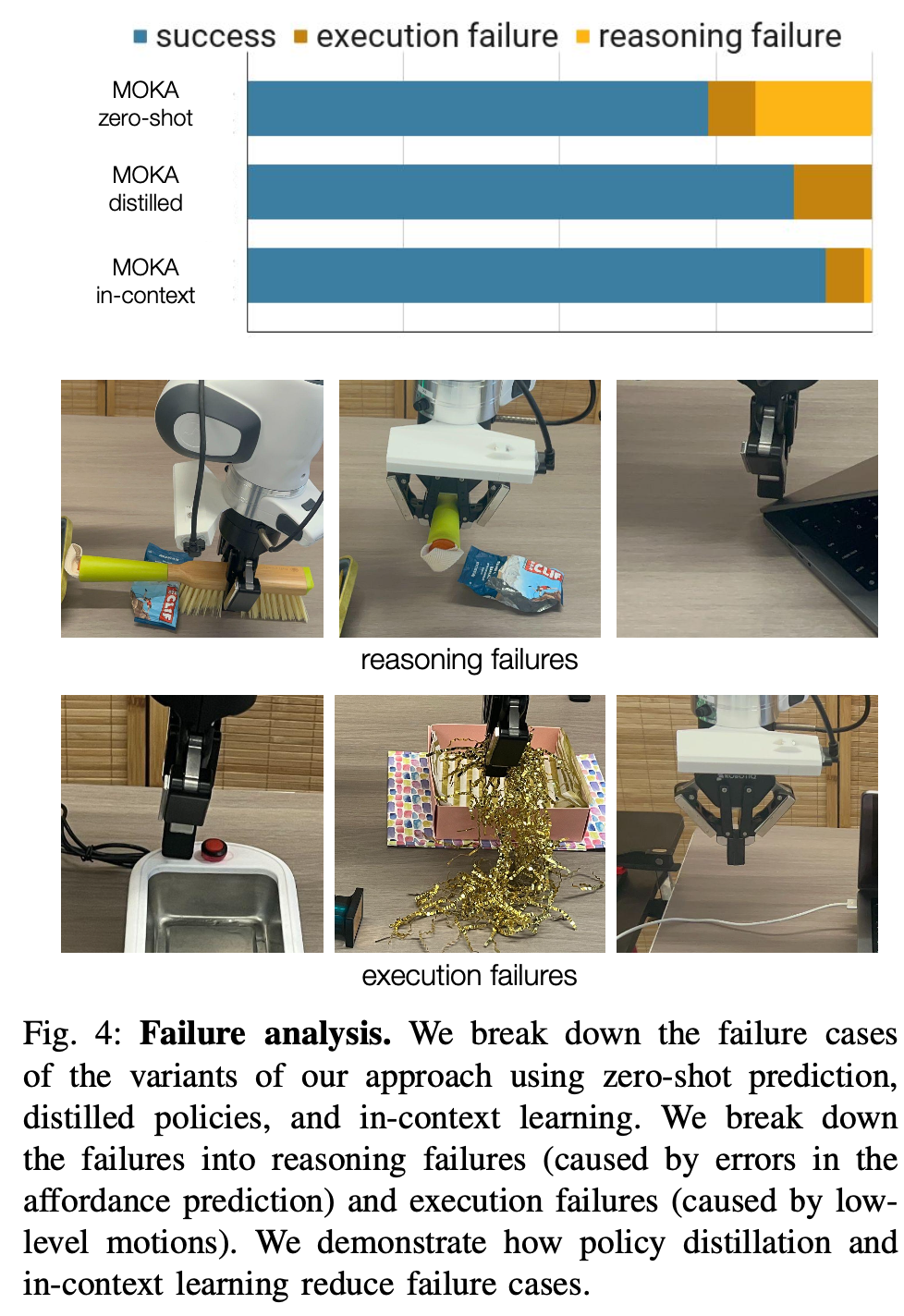 Fig 4.는 실패사례를 보이는데요. 크게 2가지의 실패 경우가 있습니다. 먼저 Reasoning Failure로 VLM으로부터의 키포인트 예측 자체가 잘못되는 경우입니다. 이런 경우 빗자루를 잘못된 방향으로 잡거나, 목표 지점을 혼동하는 경우로 파악할 수 있습니다. 다음은 Execution Failure인데 동작 수행 중에 물리적인 제약으로 실패하는 경우를 말합니다. 예를 들면 버튼을 나름 눌렀는데도 위치나 힘 등에서 애매한 오차가 있거나, rigid하지 않은 물체의 경우 잡을 때의 안정성이 떨어지는 경우 등이 있겠습니다. 이는 zero-shot 에서 당연히 많은 사례가 일어났기에 저자들은 distilled 방식과 in-context 방식으로 실패 개선을 이룰 수 있었다고 합니다.