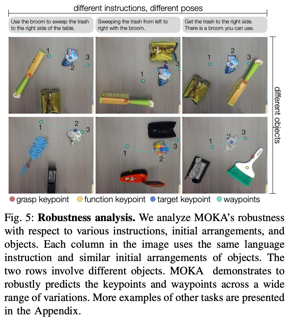 위의 Fig3에서는 작업과정에서의 키포인트와 궤적을 보여줍니다. 예를 들어 테이블 닦기의 경우에는 빗자루의 키포인트를 지정하고, 쓰레기를 쓸어내는 궤적을 생성하는 모습을 보이는 것을 확인할 수 있고, 전원 버튼 누르기 작업에서는 버튼 위치를 정확히 파악하고 누르기 동작을 수행하는 것을 볼 수 있습니다. 이렇듯 MOKA의 키포인트 기반 매니퓰레이션 접근법은 꽤나 시각적으로 직관적일 수 있다는 게 장점인 것 같고, 도구 사용, 물체 간 상호작용 매니퓰레이션 등에 있어서는 기존 action policy code generation 기반 CaP보다 더 복잡한 태스크에 적응하기 쉬울 수 있겠단 생각도 듭니다. 그럼 또 차라리 이 둘의 방식을 섞으면 어떻게 될까? 라는 생각도 또 들고요.