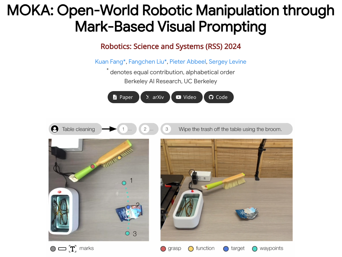 안녕하세요. 이번 논문은 VLM과 visual prompting을 활용한 open-world 환경에서의 Robot Manipulation 태스크 관련 논문입니다. 자세히는 free-form language instruction 에 대해 VLM visual prompting을 활용한 Marking Open-World Keypoint Affordance(MOKA) 기법을 제안하여 VLM의 예측 – 실제 세계의 로봇 action 을 연결하는 과정으로 Robot Manipulation을 수행하는 태스크입니다. 아 참고로 이 논문에서 말하는 VLM이란 CLIP 등의 VLM이 아니라 GPT-4V 즉 MLLM을 두고 VLM이라고 말하고 있습니다 참고하여 읽어주시길 부탁드립니다. 리뷰 시작하겠습니다.