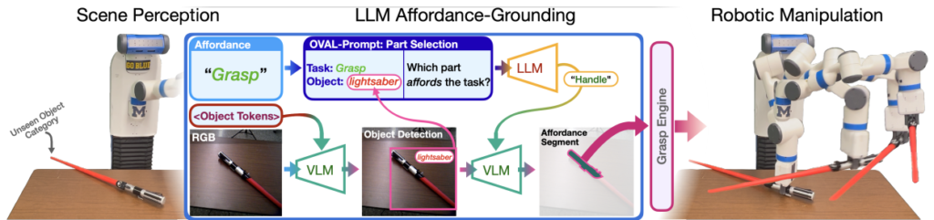 과연 LLM이 affordance를 이해할 수 있을까? 라는 질문에서 출발한 해당 논문은 기성 VLM과 LLM을 적절히 활용하여 finetuning 없이 객체의 affordance를 이해하고 처리할 수 있는 능력을 미리 훈련된 데이터가 없는 Open Vocabulary상황으로 확장했다는 점에 초점을 맞췄습니다. 이러한 일반화 능력은 가정환경이나 사무실 처럼 다양한 객체들이 많고 유연하게 작동해야 하는 환경에서 특히 강점을 가진다고 합니다.