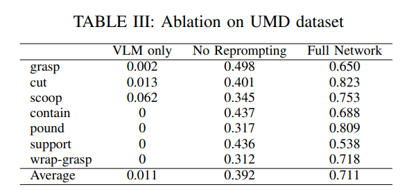 저자는 LLM 없이 어포던스 목록과 함께 VML만 사용한 경우, VLM이 LLM의 query에 대한 part segmentation을 진행하지 못 했을 때 reprompting을 하지 않은 경우, Full Network로 나누어서 실험을 진행했습니다. 당연한 이야기이지만 자연어 이해 능력이 부족한 VLM만을 사용한 경우 거의 task를 진행할 수 없었습니다. 또한 Reprompting 과정의 필요성을 어필했습니다. 다만 reprompting을 통해 VLM이 이해할 수 있는 query를 만들어 내는것이 모든 경우에 affordance를 이해한 segmentation을 진행하는데 도움이 되는지는 약간 의문입니다.