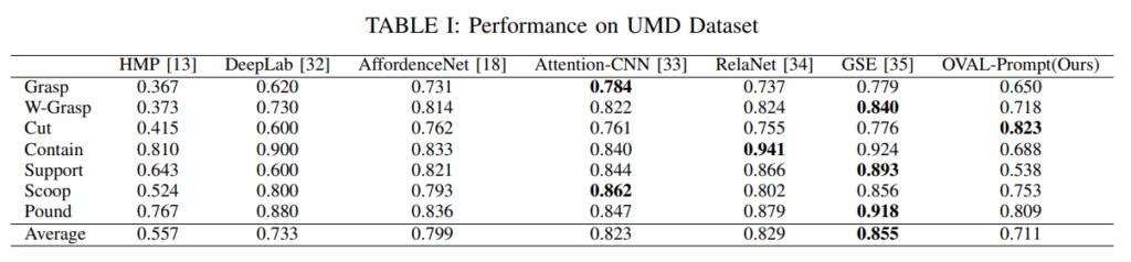 저자들은 UMD 데이터셋으로 OVAL-Prompt를 사용한 파이프라인이 HMP, GSE등의 모델과 비교해서 얼마나 affordance를 이해하고 있는지 실험했습니다. UMD 데이터셋은 7개의 affordance와 17개의 객체 클래스를 가지고 있는 데이터셋이고, 평가지표로 베타 파라미터가 1인 Weighted F-score를 사용한다고 합니다. 저자들의 실험에서도 동일한 평가지표가 사용되었습니다. 실험 결과는 아래와 같습니다. OVAL-Prompt로 진행된 파이프라인은 다른 모델들과 비교해 HMP보다 0.154 높고, GSE 모델 보다는 0.144 정도 낮지만 실제 응용에 적합한 수준이라는 결론을 내렸다고 합니다.