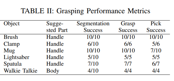 Grasping의 경우 위 사진처럼 DexNet을 top-down pick-up (인형뽑기 기계처럼 수직으로 들어 올리는 방법)으로 변형시켜 그리퍼의 z축 방향을 고정시켜 아래를 보게 하고 진행했습니다. VLM이 part를 segmentation 하는 경우 아래 표와 같이 파지 성공률이 거의 100퍼센트에 달했고, 그렇지 못하고 객체 전체를 segmentation하는 경우에는 비교적 아쉬운 결과를 보였다고 합니다. 하지만 이러한 grasping이 의미가 있을까,, 싶습니다.