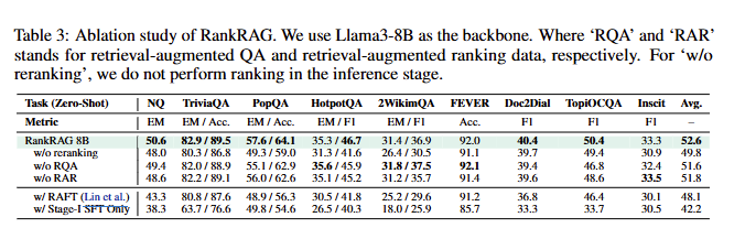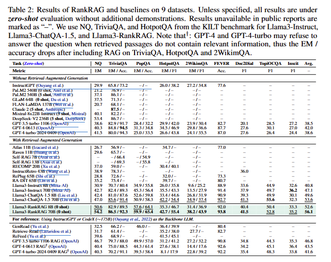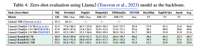 • RankRAG가 다른 모델에 비해서 높은 성능 달성