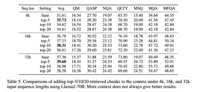 → LLM은 너무 많은 청크된 context를 그리 잘 읽지는 못합니다. 예를 들어서, top-100개의 context를 읽는 거는 효율성 때문에라도 어렵고, 일반적으로 top-5, top-10개의 context가 더 높은 정확도를 보입니다. 이는 ICLR 2024 논문인 “RETRIEVAL MEETS LONG CONTEXT LARGE LANGUAGE MODELS”의 Table 5를 보면, top-$k$가 늘어남에 따라 성능이 하락하는 것을 볼 수 있습니다. LLM이 처리하는 context가 늘어날 수록 버거워하는 것이죠.