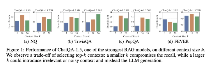 • Trade-off of Picking Top-k Contexts : 많은 SOTA LLM은 대량의 검색된 context를 입력으로 받아 답변을 생성합니다. 하지만, 성능의 경우, context가 증가함에 따라, 즉 k가 증가함에 따라 성능이 빨리 정체되는 경향이 있습니다. 이를 Figure 1을 통해서 확인할 수 있는데요. Figure 1을 보면, 성능이 높은 RAG 모델 중 하나인 ChatQA-1.5를 예시로 들었는데, k=10일 때 답변 생성 성능이 정체되는 결과를 볼 수 있습니다. 일반적으로 더 작은 k는 쿼리와 관련된 정보를 포착하지 못해 recall이 저하되는 반면, 더 큰 k는 recall을 개선하나 LLM이 답변을 생성할 때 이를 방해하는 무관한 콘텐츠를 포함할 가능성이 있습니다.