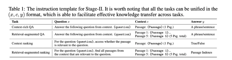 Stage-1에서 SFT를 통해서 LLM이 basic한 instruction-following capablities를 가지도록 하였다면, Stage-2에서는 RAG 능력을 개선하고자 합니다. RankRAG는 LLM을 retireval-augmented generation 뿐만 아니라 context ranking 모두를 고려하기 위한 instruction tuning을 수행합니다.
