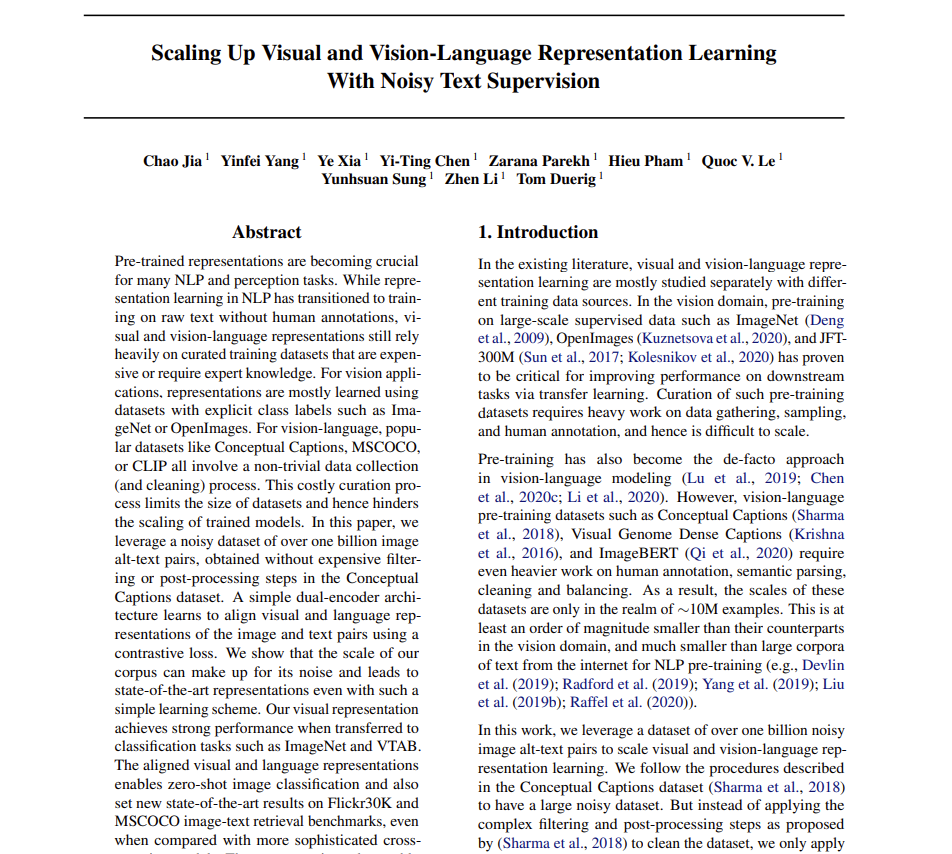안녕하세요, 허재연입니다. 오늘 리뷰할 논문은 google research에서 2021년 ICLR에 게재한 ALIGN: Scaling Up Visual and Vision-Language Representation Learning With Noisy Text Supervision 이라는 논문입니다. CLIP과 비슷한 시기에 나온 비슷한 컨셉의 논문으로, 학습 방법론도 크게 다르지 않지만 역시 학습 데이터셋에 차이가 있습니다. 한번 살펴보도록 하겠습니다.