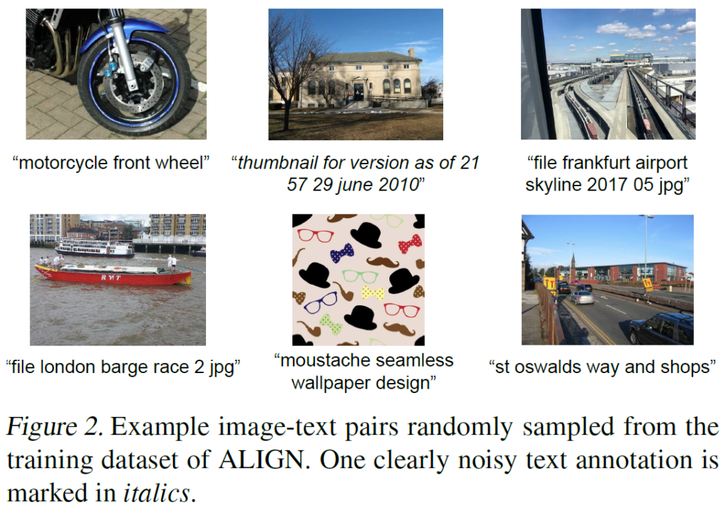 conceptual captions의 경우 위와 같은 강력한 필터링 및 후처리 과정을 거쳐 정제되었지만, 본 논문의 저자들은 데이터의 규모를 확장하기 위해 이러한 정제 과정을 대부분 생략하는 전략을 취했습니다. 원본 연구에서 적용한 복잡한 정제 과정을 완화해 어느 정도 데이터 품질을 일정 부분 희생하는 대신, 데이터의 규모를 극대화한 것이죠. 그래도 필터링을 아예 안 할 수는 없으니, 다음과 같이 최소한의 빈도 기반 필터링만 적용하였습니다. 그 결과, 18억개의 image-text 쌍으로 구성된, 기존보다 훨씬 더 큰 대규모 데이터셋을 구축할 수 있었습니다. Figure 2에서 그 예시를 볼 수 있는데, jpg가 걸러지지 않는 등 caption이 정리되지는 않은 듯한 모습을 보입니다.
