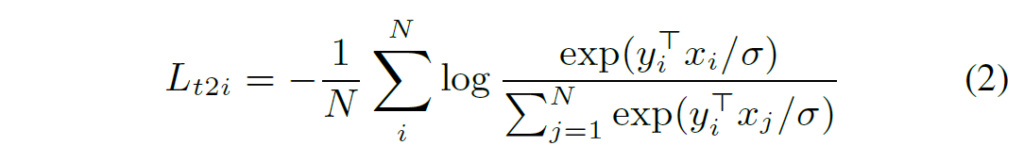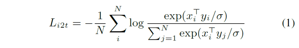 {x}_{i}{y}_{j}는 각각 i번째 pair의 영상과 j번째 pair의 텍스트의 normalized embedding 벡터입니다. N은 배치 사이즈이고, sigma는 contrastive loss에서 항상 함께 등장하는 temperature loss입니다. logit의 smoothness를 조정해주는 역할이라고 생각하시면 됩니다. temperature value의 경우 학습으로 적절한 값을 찾았다고 하는데, BLIP도 그렇고 VLM 모델들은 temperature을 learnable parameter로 사용하는데 SimCLR와 같은 이전의 image contrastive learning 방법들과 다른 점 같아 눈에 띄네요.