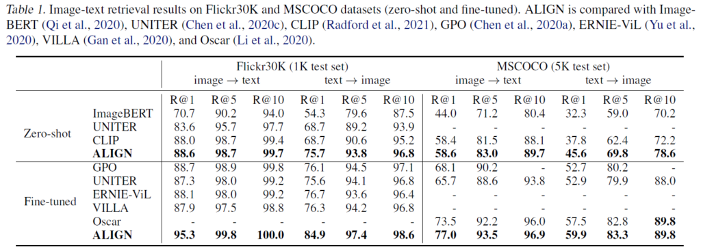 Table 1에서 기존 방법론들과의 성능 비교를 나타내었는데, Flickr30k와 MS COCO 벤치마크에서 ALIGN이 SOTA를 달성하였습니다. zero-shot setting에서는 ALIGN이 기존 SOTA였던 CLIP보다 R@1에서 부려 7%나 개선된 결과를 보여주었습니다. fine-tuning을 했을 때에도 기존 방법론들보다 ALIGN이 큰 차이로 가장 좋은 결과를 보여주었습니다.