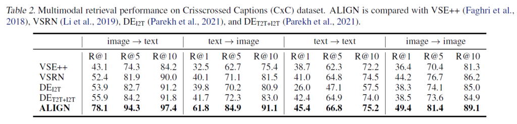저자들은 ALIGN을 image-to-text 및 text-to-image retrieval task에서 finetuning 없이 평가하였습니다. 데이터셋으로는 Flicker30K와 MSCOCO를 사용했고, 추가적으로 MS COCO에 추가적인 주석을 달아 확장한 Crisscrossed Caption(CxC) 데이터셋을 사용하였습니다. 학습 셋은 본래의 MS COCO와 동일하므로, MSCOCO에서 파인튜닝된 ALIGN모델을 CxC의 annotation을 통해 평가할 수 있다고 합니다