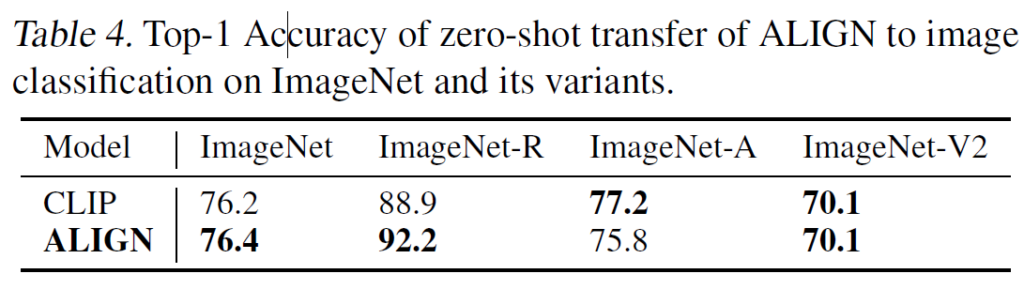 클래스 이름(classname)의 텍스트를 직접 텍스트 인코더에 입력하면, ALIGN은 이미지-텍스트 검색(image-text retrieval)을 통해 이미지를 후보 클래스 중 하나로 분류할 수 있습니다. Table 4에서는 ImageNet 및 그 변형 데이터셋에서 ALIGN과 CLIP을 비교한 결과를 나타내었습니다. CLIP과 마찬가지로, ALIGN도 다양한 이미지 분포에서 강력한 분류 성능 및 높은 robustness을 보였습니다. 공정한 비교를 위해, 저자들은 해당 실험에서 CLIP과 동일한 프롬프트 앙상블링 방법을 사용하였다고 합니다. 각 클래스 이름은 CLIP에서 정의한 프롬프트 템플릿(ex: “A photo of a [classname]”)을 활용하여 확장하였습니다. 클래스 임베딩(class embedding)은 모든 프롬프트 템플릿을 사용하여 계산된 임베딩의 평균을 구한 후, L2 정규화를 수행하여 사용하였습니다. 이러한 앙상블링 기법을 적용했을 때 ImageNet에서 top-1 accuracy가 2.9% 향상되는 것을 확인할 수 있었다고 합니다.