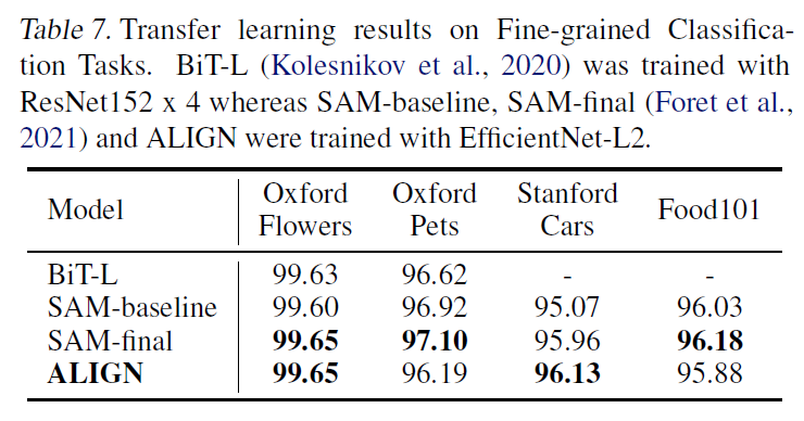 fine-grained classification benchmark에서도 간단하게 fine-tuning 한 뒤 평가를 진행하였다고 합니다. 평가 결과를 Table 7에 나타내었는데, ALIGN은 복잡한 튜닝을 시도하지 않았음에도 기존의 SOTA 성능에 견주는 결과를 보일 수 있었다고 합니다.