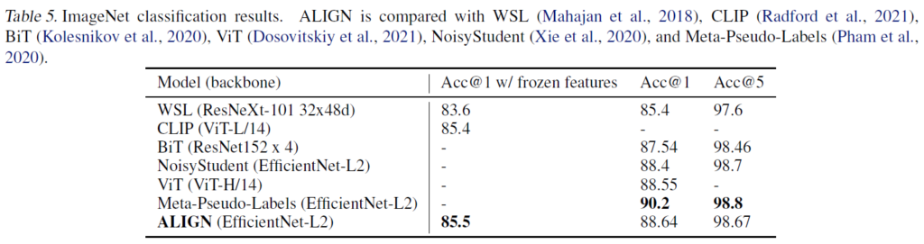 ImageNet 벤치마크에서, 먼저 학습된 visual feature를 freeze한 상태에서 classification head만을 학습시킨 다음 모든 계층을 fine-tuning하였습니다. 학습 과정에서는 배치 사이즈 1024를 사용했으며, optimizer는 SGD를 사용하였습니다(사전학습과 학습 세팅이 다르므로 다른 배치와 optimizer를 사용한 듯 합니다) Table 5에 ImageNet Benchmark에서의 기존 방법론들과 ALIGN 성능 결과를 비교하였는데, frozen feature에서 ALIGN은 CLIP보다 큰소하게 나은 결과를 보여 SOTA를 달성하였습니다. fine-tuning 이후에는 ViT 및 BiT보다 높은 정확도 성능을 보이며, imagenet 학습과 large-scale unlabeled data 간 더 많은 연관관계를 필요로 한 Pseudo Label를 제외한 방법론들과의 비교에서 가장 좋은 성능을 달성하였습니다.