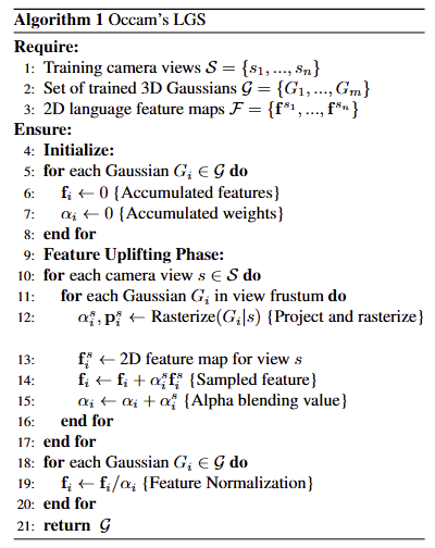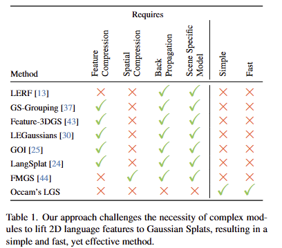 이번 리뷰 논문은 3D Language Feature Splatting 기법에 대해서 다루고자 합니다. 제목 중 Occam이라는 용어가 보일 겁니다. 저 용어는 Occam’s Razor (오컴의 면도날)라는 단순의 미학을 의미하는 격언?에서 따온 말입니다. 즉, 기존 3DLF가 너무 복잡하게 수행되어져 왔다. 그냥 단순하게 해보자 라는 의미입니다. 실제로 저자는 시각-언어 특징에 대해 별도의 학습 없이 그대로 올리는 것 만으로도 충분한 성능을 보장 할 수 있음을 실험적으로 보입니다.