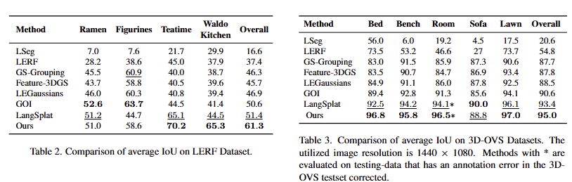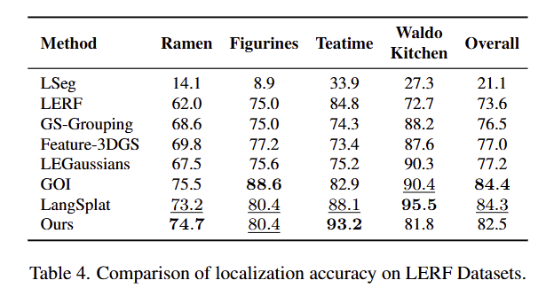 LERF와 3D-OVS에서의 정량적 결과, 기존 기법들을 뛰어넘는 결과를 보여주고 있음. LERF의 경우, LangSplat 대비 약 10%의 성능 향상을 보여줌