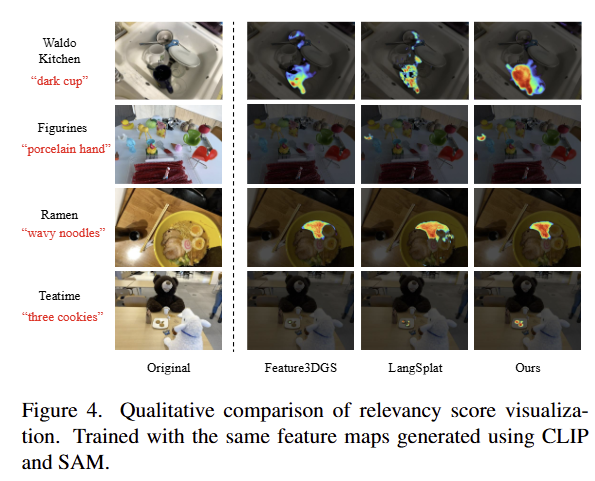 이러한 문제점을 해소하기 위해서 저자는 시각-언어 특징 정보를 그대로 사용하면서, 불필요하게 3DGS에 시각-언어 특징 정보를 학습을 시키지 않고, forward rendering에 시각-언어 특징 정보들을 활용하는 방법을 제시합니다. 해당 기법은 총 프로세스 시간 16.35~31.93s를 달성했으며, 성능 측면에서도 SOTA를 달성한 결과를 보여줍니다.