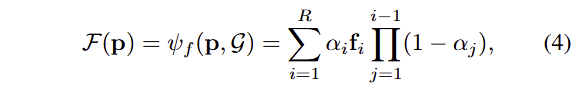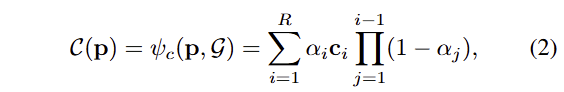 최종적으로 컬러 값들은 아래 수식을 통해 기여도에 따른 alpha α에 대한 alpha blending을 통해 얻어 집니다.