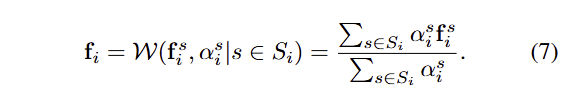 단순하게 다중 뷰에서 얻어진 특징 정보들 aggregation하게 되면 생성된 특징 정보에 노이즈가 발생할 수 있습니다. 어떤 뷰에서는 한 Gaussian이 거의 보이지 않거나 심하게 가려져 있어 그 기여도가 신뢰할 만하지 않을 수 있습니다. 이를 해결하기 위해, 우리는 feature aggregation process에서 각 뷰에서의 Gaussian 기여도를 고려합니다. 각 Gaussian G_i에 대해, view s에서 직접 투영된 pixel position p^s_i에서의 기여도 α^s_i를 가중치로 활용합니다. 그러면 가중치가 적용된 feature aggregation function 는 다음과 같이 표현할 수 있습니다.