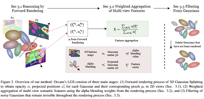 해당 기법에서는 LangSplat이 수행하는 방법이 아예 생략되었고 더 간단한 방법으로 대체 됩니다. 저자가 제안하는 요소를 정리하면 fig 2와 같이 Reasoning by Rendering, Weighted Feature Aggregation 그리고 Filtering에 해당합니다.