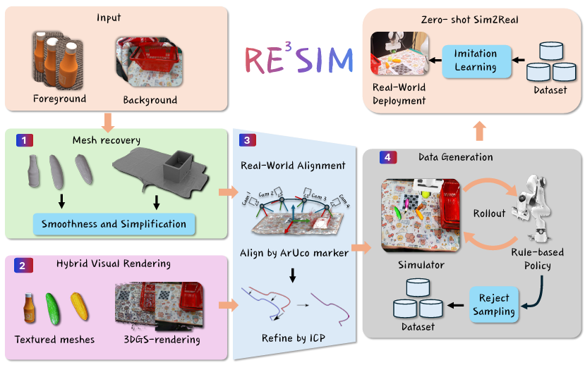 실제 환경에서 전문가의 Teleoperation을 통한 데이터 수집은 뛰어난 일반화 능력이 있지만 시간과 비용이 정말 많이 발생합니다. 반면 시뮬레이션 데이터는 기하급수적으로 데이터를 확장할 수 있기 때문에 로봇 정책 학습을 위한 데이터를 만들 때 지속가능한 대안이 될 수 있습니다. 문제는 시뮬레이션으로 현실을 옮길때의 gap이 크다는 점입니다. 미리 만들어진 CAD 모델은 이상적인 구조를 가정하고 만들었기 때문에 이러한 모델을 합성해서 만든 데이터는 sim-to-real gap이 클 수 밖에 없습니다. 구조적인 문제 뿐 만 아니라 센서의 노이즈나 부정확한 렌더링은 시각적으로도 gap을 유발합니다. 이런 sim-to-real gap을 줄이기 위해 저자들은 3D-photorealistic real-to-sim-to-real system인 RE3SIM을 제안했습니다. MVS와 Gaussian rasterization 기법을 사용해 기하학적인 구조와 시각적인 렌더링을 실제와 유사하게 복제할 수 있다고 합니다. 나아가 시뮬레이션 환경에서의 물리엔진을 통해 역학적인 요소들도 구현하고, hybrid rendering 엔진을 통해 실시간으로 렌더링을 할 수도 있다고 합니다.