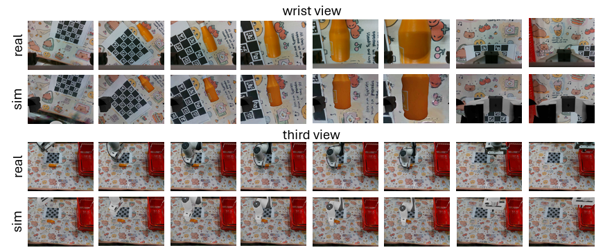 real-to-sim의 전반적인 파이프라인은 위 figure의 (b)와 같으며 장면 및 객체의 기하학적 구조를 재구성하는 mesh recovery, 전경과 배경을 합성하는 hybrid visual rendering, 실제 환경과 시뮬레이션 환경 간의 좌표를 동기화하는 real-world alignment로 구성됩니다. 이 과정에서 인간의 개입은 장면의 영상 촬영과 ArUco 마커를 배치해 로봇 베이스 정렬을 위한 추가적인 사진을 통해 real-world alignment를 수행만 필요합니다. 3분 이내에 새로운 장면을 재구성하고 두 개의 카메라를 통해 24FPS의 렌더링을 할 수 있다고 하네요. (c)의 결과를 보면 정말 실제와 유사한 모습을 볼 수 있습니다.이를 활용해 설계한 real-to-sim-to-real 프로세스는 위 figure의 (a)와 같은 zero shot 작업에서 58%의 작업성공률을 보여주면서 향후 일반화 가능한 로봇 정책의 기반이 될 것으로 기대한다고 합니다. 마지막 (d)를 보시면 시뮬레이션과 real world간의 격차가 거의 없는 것을 볼 수 있습니다.