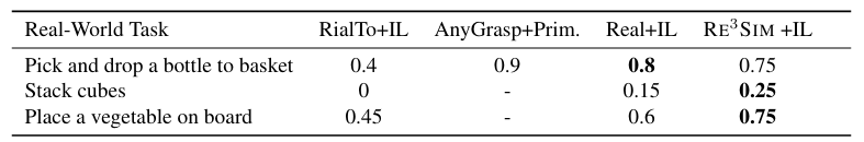 ㄷㅏ음으로는 두 번째 질문인 작은 3D sim-to-real gap을 유지하며, RE3SIM이 실제 로봇 조작 문제를 해결하는 데 도움이 되는가?에 대한 답을 얻기 위해 table top환경의 manipulation task를 설계해서 평가했습니다. 25cm × 35cm 영역 내에서 무작위로 배치된 오렌지색 병을 집어 바구니에 넣어야 하는 task, 35cm × 50cm 영역 내에 무작위로 배치된 오이를 무작위로 배치된 도마에 올리는 task, 무작위로 배치된 큐브를 쌓는 task로 실험을 진행했습니다. RE3SIM을 통해 수집된 정책의 비교대상은 RialTo였습니다. 아래 표에 제시된 수치 결과를 분석한 결과, RE3SIM을 통해 생성된 데이터는 정책이 Zero-Shot Sim-to-Real 전이를 달성하는 데 중요한 역할을 하는 것으로 나타났다고 합니다. 기존 real-to-sim grasping 방법과 비교했을 때도 RE3SIM 기반의 학습된 정책이 강력한 성능을 보였습니다. 특히, RE3SIM을 이용하여 구축한 대규모 합성 데이터셋에서 학습한 정책은 실제 환경에서 수집한 데이터만으로 학습한 정책과 비교했을 때 오히려 더 높은 성능을 기록하였다고 합니다. 단순하게 시뮬레이션 데이터를 사용하는 것이 아니라, 고품질의 시뮬레이션 환경이 실제 환경에서의 조작 성능을 크게 향상시킬 수 있다는 것을 아 ㄹ 수 있었습니다.