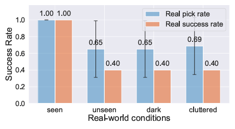 더 나아가서 저자들은 세번째 질문인 대규모 시뮬레이션 데이터가 보다 복잡한 실제 조작 작업에서 도움이 되는가?에 대한 실험도 진행했습니다. 이를 위해서 무작위로 배치된 모든 물건들을 바구니에 넣는 long horizon task를 통해서 실험을 진행했습니다. 이 때 이 task를 진행하면서 로봇이 본 적 없는 물체들도 조작할 수 있는지 평가했다고 합니다. 충분한 평가를 위해 seen, unseen, cluttered(seen unseen 혼합), darkness(조도 변화)로 설정하고 진행했습니다. 10번 반복해서 진행했고, grasping에 실패했을 경우 두 번의 추가 기회를 주었다고 합니다.